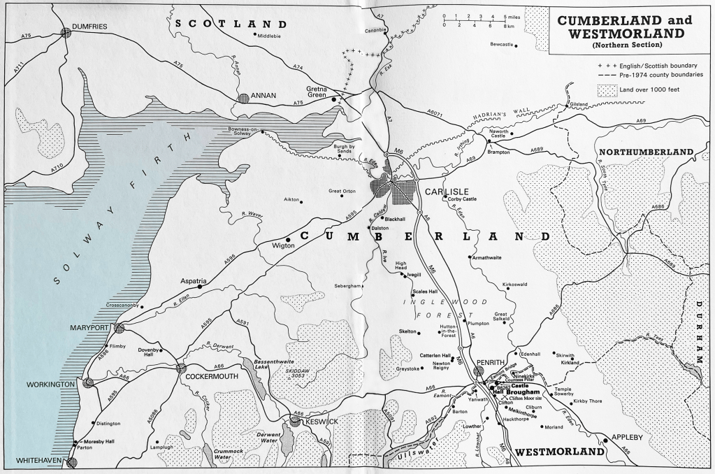 This map shows Brougham, just south of Penrith, east of the road north to Carlisle, just below the Cumberland-Westmoreland county line. Scales Hall lies just west of the road north about half way between Brougham and Carlisle.