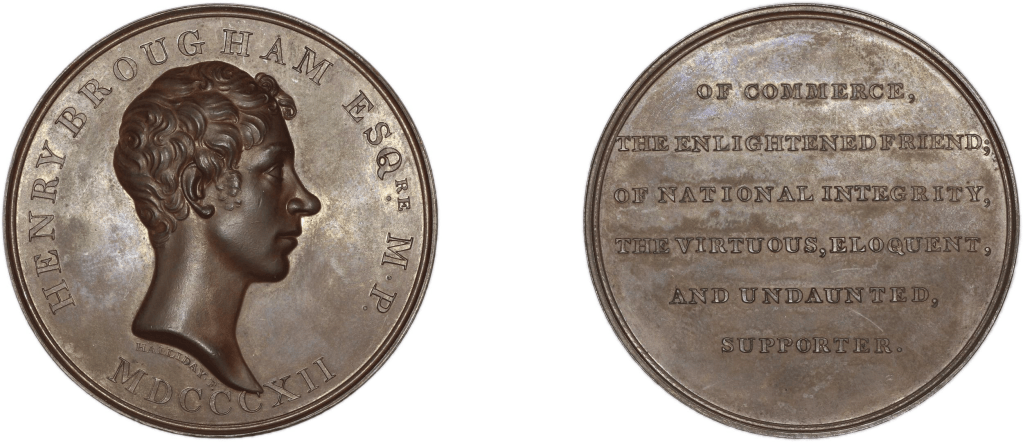 And he got right to work. This medal refers to Brougham’s opposition to the Orders in Council of November, 1807, prohibiting trade with France and the countries dependent upon her, and insisting on American vessels coming first to British ports and paying a tax.