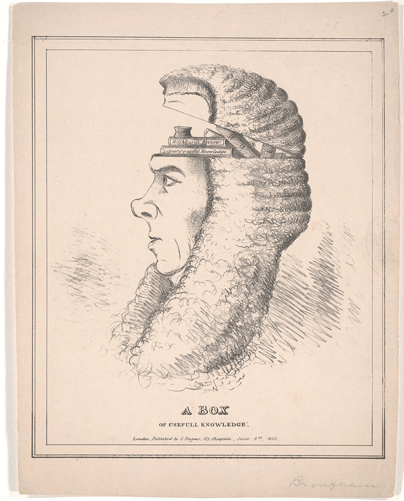 And he was satirized for it. This caricature of Brougham with books in his head, titled “A Box of Useful Knowledge” dated 1832 was from his time as Lord Chancellor. It cleverly referenced his involvement with the publishing venture and his well know habit of giving people a piece of his mind.