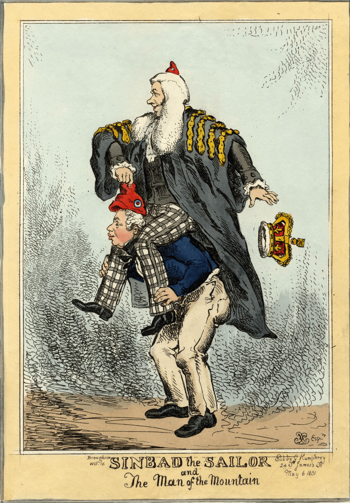 Lord Brougham is riding the Kings back, toppling his crown and replacing it with a red cap, a symbol of the French Revolution, during which another King lost his head. Surely Lord laddie boy Brougham is just horsing around with his Sovereign.