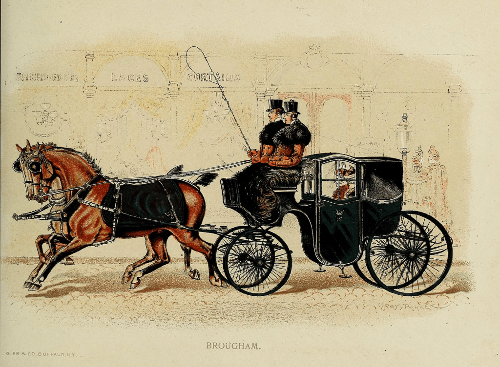 brougham, four-wheeled, one-horse carriage. As originally designed (c. 1838) by Henry (later Baron) Brougham, a former lord chancellor of England, it had a low coupé body, appearing as if the front were cut away, that enclosed one forward-facing seat for two passengers; a coachman’s seat was attached to the front, where a third passenger could also ride.